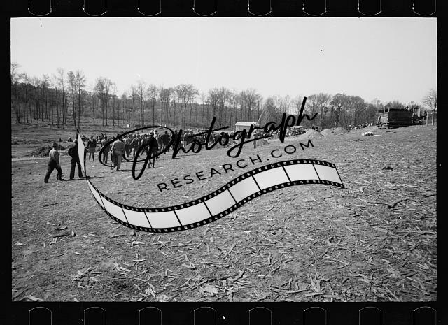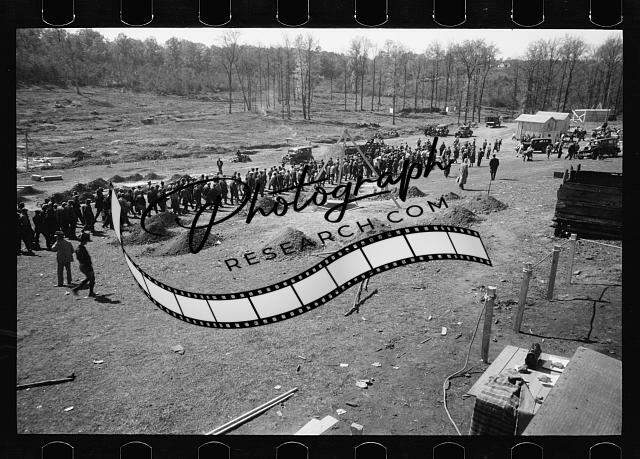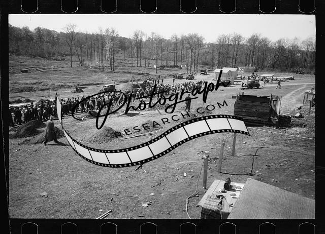 Noon day call,crowds,transient workers,automobiles,Greenbelt,Maryland,MD,1935 3