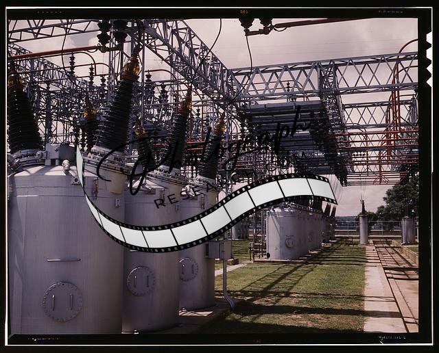 Title: Transmission line towers and high tension lines that carry current generated at TVA's Wilson Dam hydroelectric plant, near Sheffield, Ala.