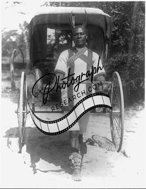 Transportation,1890-1923,Man-Drawn-Cart,Africa,man wearing horns,wheels