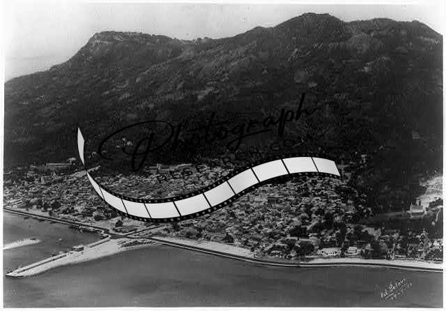 Aerial view,Cap Haitien,mountains,waterfronts,docks,piers,Haiti,E Peloux,1953