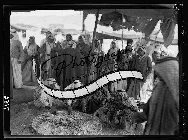 Bedouins eating around large tray in Shunet Nimrin,Jordan,Middle East,c1935