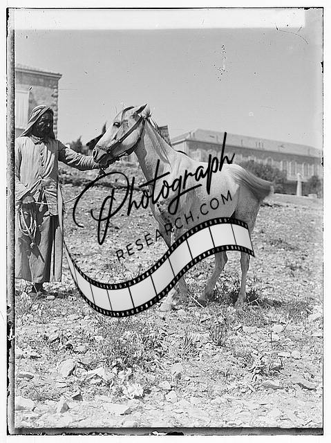 Man with horse in field near buildings,Middle East,Matson Photo Service