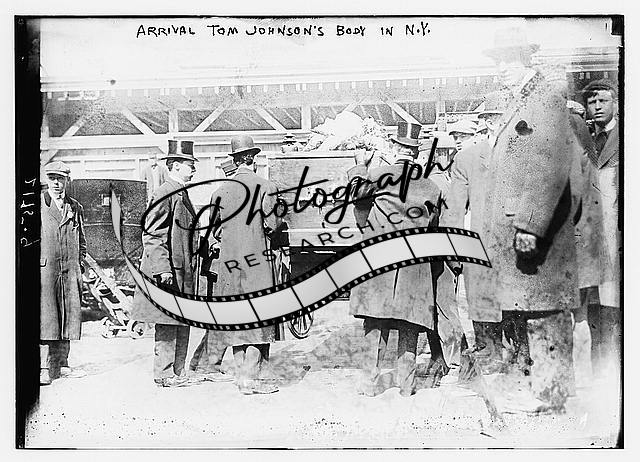 Arrival of Tom Johnson's body in New York,death,casket,people,Bain News Service