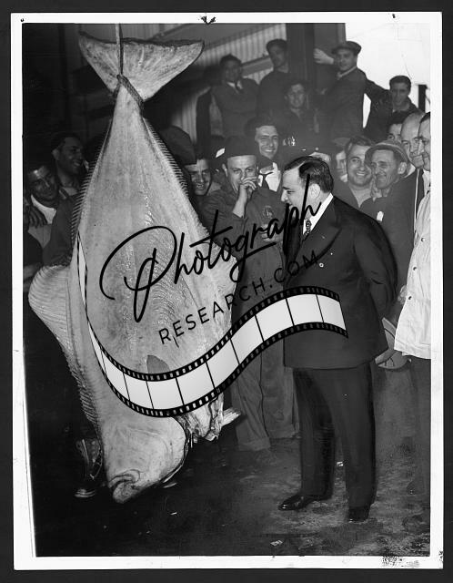 Mayor La Guardia poses with a 300-pound halibut at the new Fulton Market,Bronx