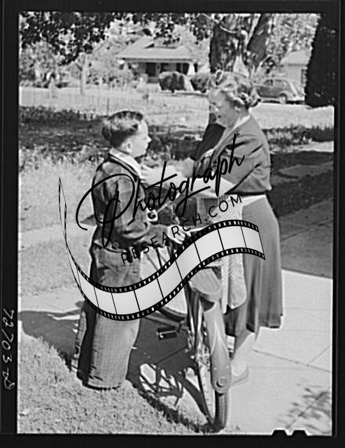 Title: Turlock, California. Housewife sending her son off to school
