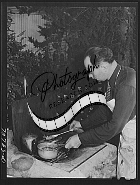 Title: Turlock, California. Housewife serves dinner in the backyard of her home. Menu: barbecued steaks, fresh peas, potato salad, potato chips, celery and olives, strawberry shortcake, and coffee