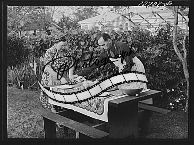 Title: Turlock, California. Man of the house barbecues steaks over open grill in his backyard. This family keeps vegetables, fruits and meats in frozen food lockers in town