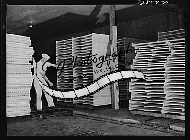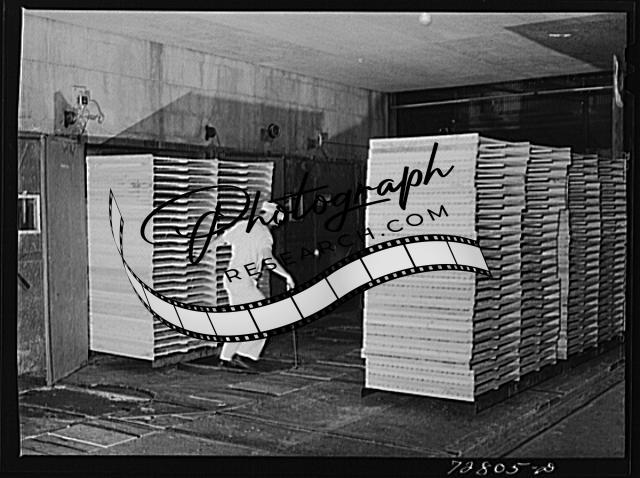 Title: Turlock, California. Dehydrated cabbage is pumped from tray on which it was dried. Dehydrating plant