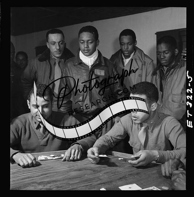 Tuskegee Airmen playing cards in the officers' club in the evening,Walter Downs