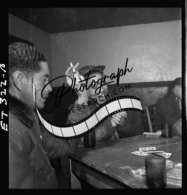Summary: Photograph shows standing, Woodrow W. Crockett, seated, Edward C. Gleed, Lawrence, KS, Class 42-K, Group Operations Officer. Ramitelli, Italy, March 1945. (Source: Tuskegee Airmen 332nd Fighter Group pilots.)