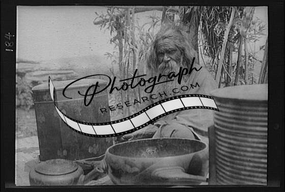 Ainu man outdoors,mat covered,clay containers,vessels,village,Arnold Genthe,1908