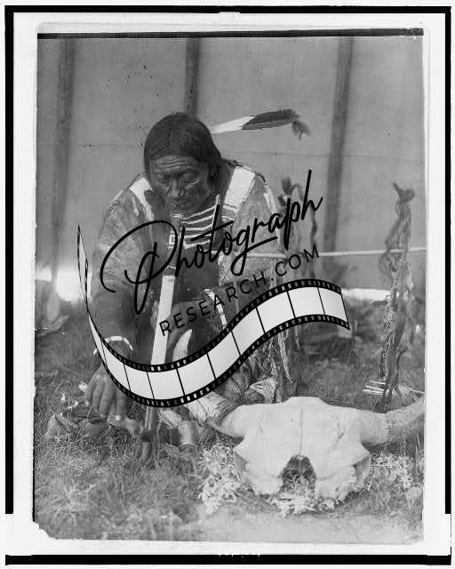Saliva,Dakota Indian Man with camulet kneeling by altar inside tipi,feather,1907
