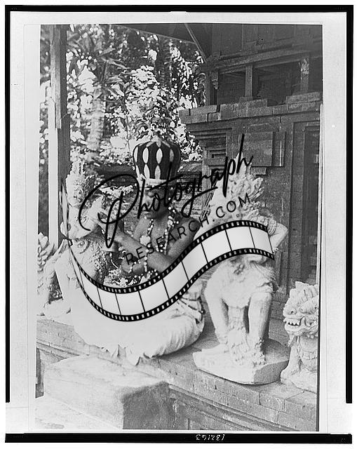 Brahamic priest seated between two statues of Hanuman(?) on the paruman or pepelik pavilion at a Balinese temple