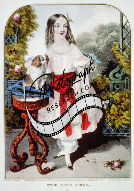 The two pets,c1848,Currier & Ives Photo,dog,little girl,white dress,outside