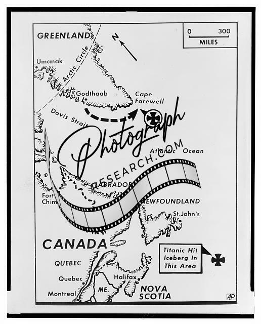 Where ships met icebergs, indicating location where the Danish ship, Hans Hedtoft, hit an iceberg January 30, 1959, on her maiden voyage; also shows location where the Titanic struck an iceberg and sank in 1912.