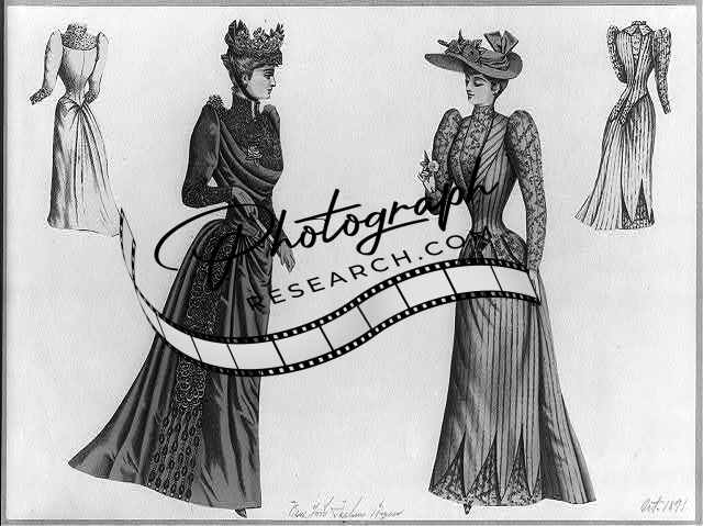 Two women wearing fashionable,dresses; back of one dress is also shown,1892