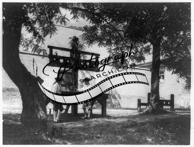 Stocks,pillory outside,restored public gaol,punish,Williamsburg,Virginia,c1937