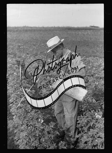 Title: Homesteader spraying potatoes, Tygart Valley, West Virginia