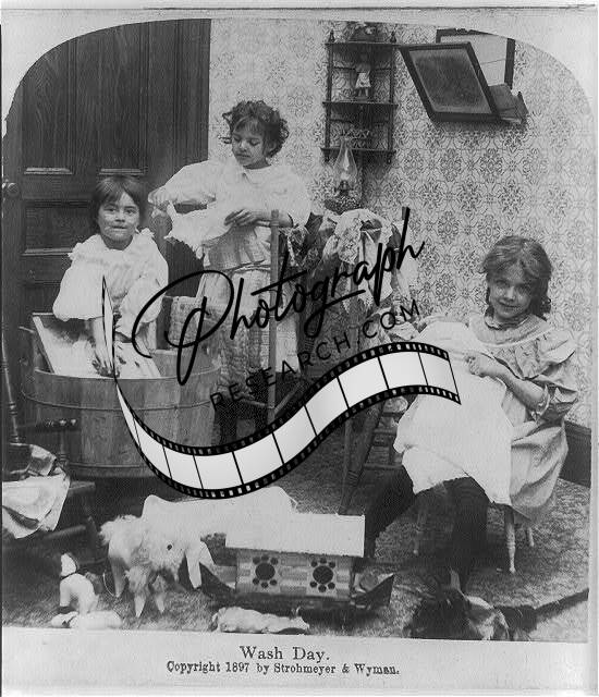 Wash Day,Laundry,Girls playing at doing laundry,Children at Play,c1897,Pretend