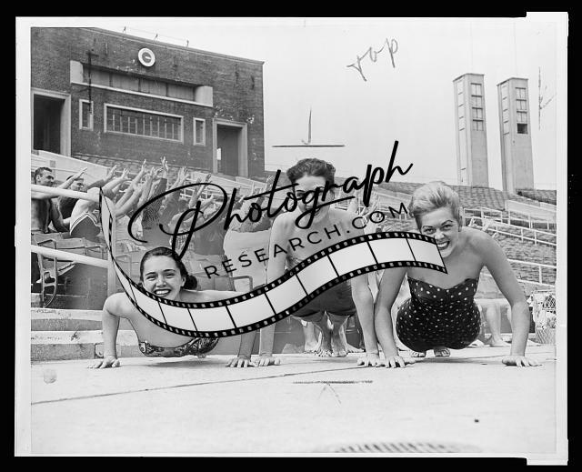 Photograph showing (l to r) Barbara Burns, Shirley Cadell, and Lesleyann Knoll, in swimsuits, doing push-ups, while people in bleachers in background raise their arms.