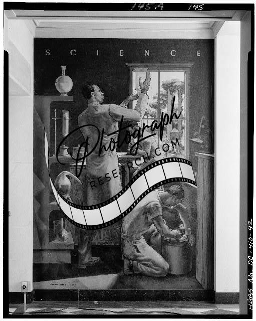 Title: 45. INTERIOR, FIRST FLOOR, SOUTHEAST CORNER OF GRAND STAIRCASE (STAIRS G), SIDE AISLE, EAST WALL, THE NEGRO'S CONTRIBUTION IN THE SOCIAL AND CULTURAL DEVELOPMENT OF AMERICA: EDUCATION MURAL - U.S. Department of the Interior, Eighteenth & C Streets Northwest, Washington, District of Columbia, DC