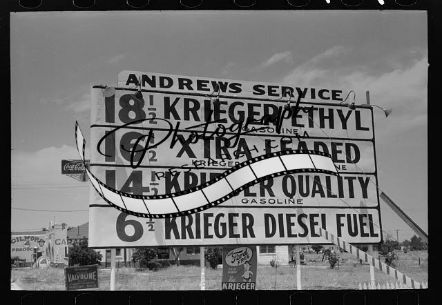Price sign of gasoline on Highway 6,Inyo County,California,CA,FSA,June 1941
