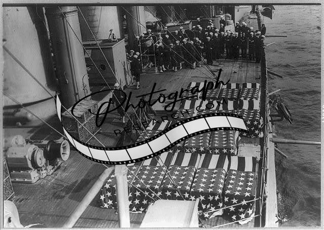 US Navy,Vera Cruz,Mexico,1914: 17 flag-draped coffins on deck of USS MONTANA
