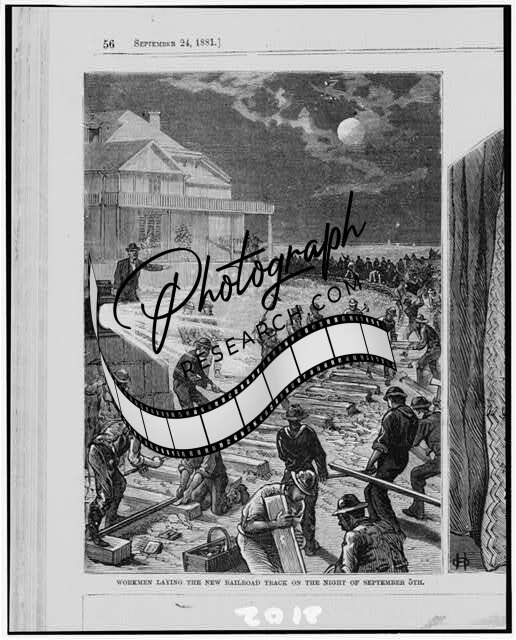 Workmen laying new railroad track,Elberon,New Jersey,NJ,1881,RR Construction