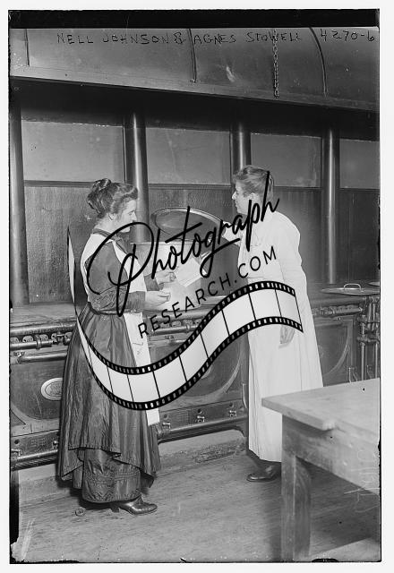 Nell Johnson & Agnes Stowell,two women in kitchen,cooking,stove,Bain News