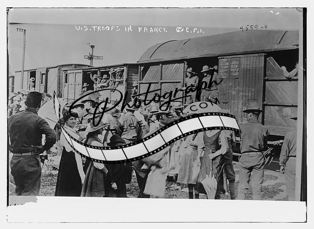 U.S. troops in France,Military,women,children,men on train,RR,Locomotive,Bain