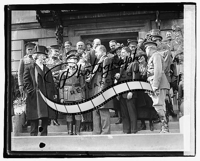 Unidentified group of men,women on steps of building,1921