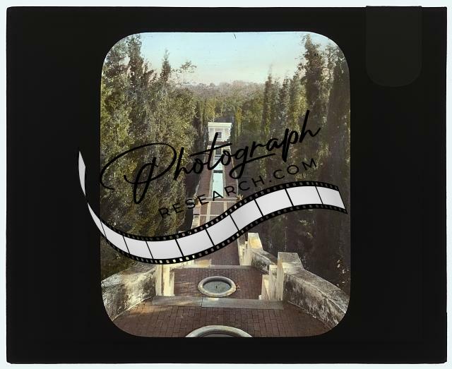 Unidentified houses and gardens. Rhododendron, field, and buildings in gardens
