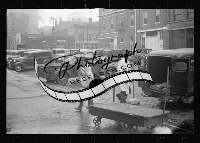 Unloading meat in wholesale district,Omaha,Nebraska,NE,November 1938,Vachon,1
