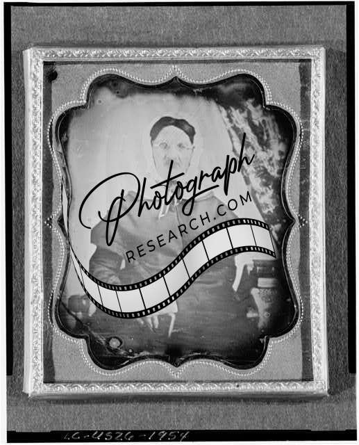 Unidentified woman,three-quarters to left,next to table with tablecloth,c1855