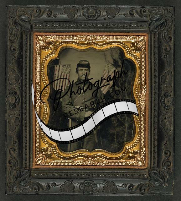 Title: [Unidentified soldier in Union uniform and shoulder scales with musket and sword]