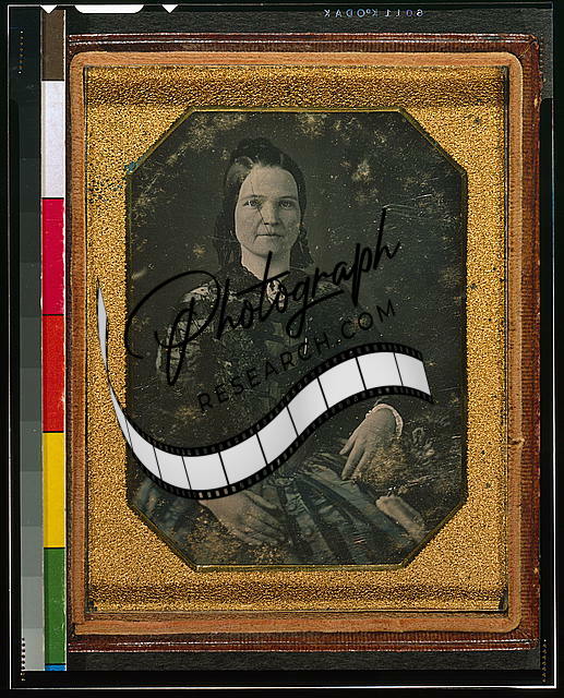 Title: [Unidentified woman, probably a member of the Urias McGill family, three-quarter length portrait, facing front, holding daguerreotype case]