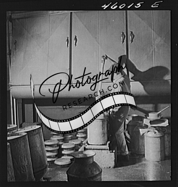 Title: Milk cans on moving belt, just out of the washing machine. The United Farmers' Cooperative Creamery, Sheldon Springs, Vermont