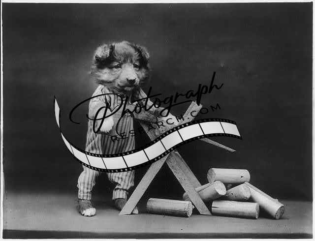 Puppies Dressed as Humans,sawhorse,c1914,Harry W Frees