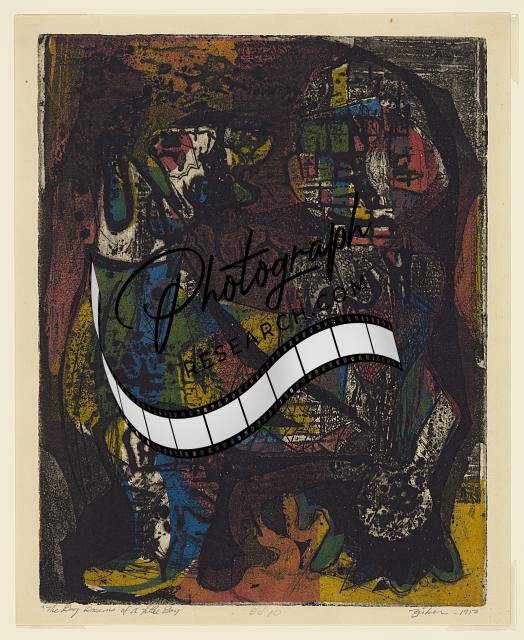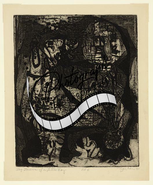 Dog dreams of a little boy,abstract print,art,aquatints,etchings,J Zirker,1952
