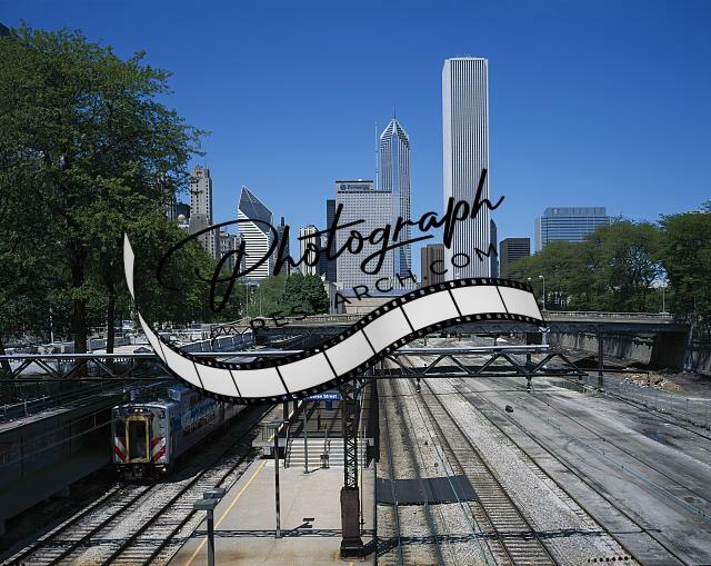 Train comes into Metra Station,Chicago,Illinois,IL,Cityscape,Skyscrapers,America