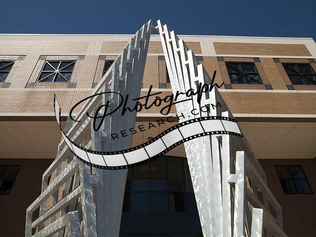 Title: Untitled neon sculpture with stainless steel ceiling, located at exterior of U.S. Courthouse, Madison, Wisconsin