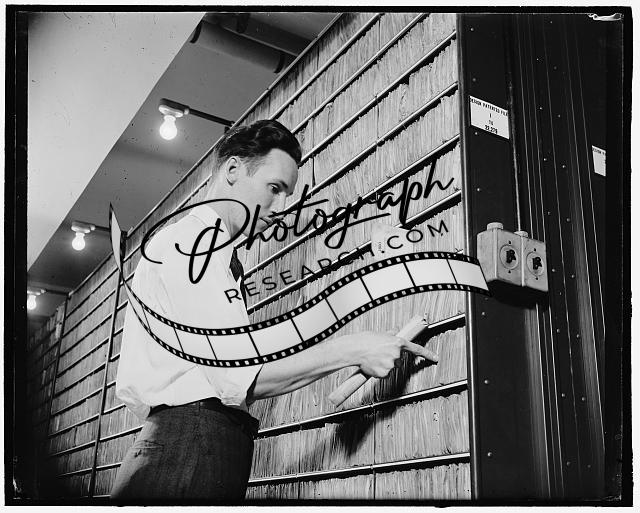 Title: Patent official, patent record files. Files of patents of which 2,180,00 have been issued. These files extend over 50 miles in total length and are kept in air conditioned portion of the building, washed air keeps paper from iridizing. Another old patent of drawing without the specification. This describes a spinning and weaving machine for cotton. December 30, 1791