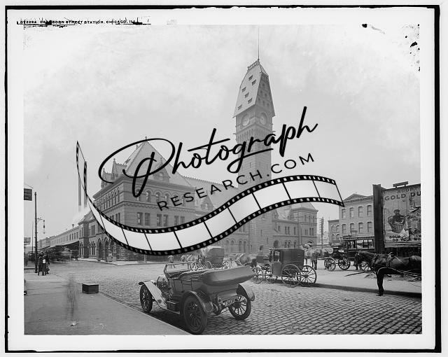 Dearborn Street station,railroad buildings,automobiles,Chicago,Illinois,IL,1910