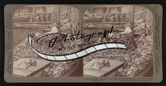 Unloading dried fish from boats into the warehouses at Tromsoe, northern Norway