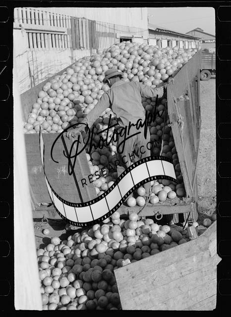 Unloading grapefruit truck,juice plant,Weslaco,Texas,TX,Arthur Rothstein,FSA,1