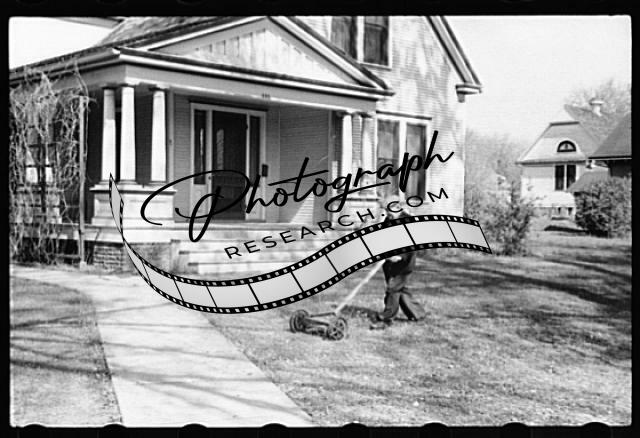 Man mowing lawn,Grundy Center,Iowa,IA,April 1940,John Vachon,FSA,United States