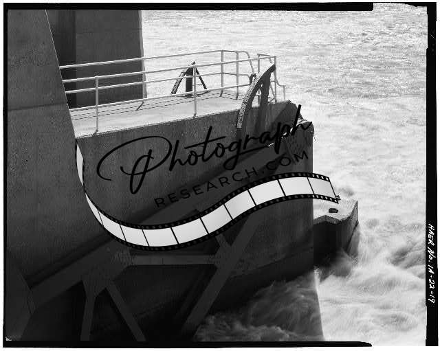 Title: 22. DETAIL VIEW OF NONSUBMERSIBLE TAINTER GATE, SHOWING TRUNNION PIN, GATE ARM AND GATE GAUGE, LOOKING NORTHWEST - Upper Mississippi River 9-Foot Channel, Lock & Dam No. 10, Guttenberg, Clayton County, IA