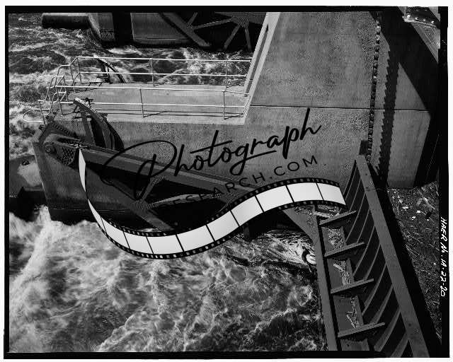 Title: 23. DETAIL VIEW OF SUBMERSIBLE TAINTER GATE, SHOWING TRUNNION PIN, GATE ARM AND GATE GAUGE, LOOKING SOUTHEAST - Upper Mississippi River 9-Foot Channel, Lock & Dam No. 10, Guttenberg, Clayton County, IA