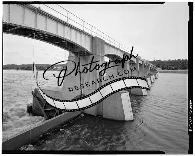 Title: 6. DETAIL VIEW OF DAM, SHOWING TAINTER GATES, GATE PIERS AND DAM BRIDGE, WITH ROLLER GATE HEADHOUSE IN BACKGROUND, LOOKING EAST, UPSTREAM - Upper Mississippi River 9-Foot Channel, Lock & Dam No. 10, Guttenberg, Clayton County, IA