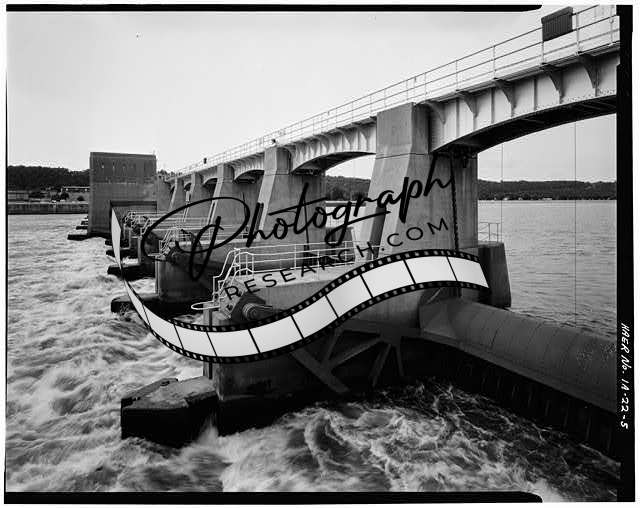 Title: 7. DETAIL VIEW OF HEADHOUSE/PIER, WITH TAINTER GATES AND PIERS IN LEFT FOREGROUND, LOOKING EAST - Upper Mississippi River 9-Foot Channel, Lock & Dam No. 10, Guttenberg, Clayton County, IA